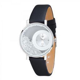 Montre femme ornée de Cristaux scintillantsLargeur cadran : 41mm - Hauteur cadran : 41mm - Epaisseur : 11mmBracelet cuir noir - Longueur : de 16 à 20cm - Largeur : 10mm - Fermoir : Boucle ardillonMatière : LaitonFinition : Plaquage haute résistanceVerre minéralMouvement Quartz haute fiabilité japona