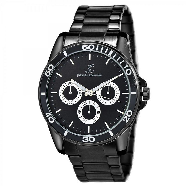 Montre homme par Pascal SzermanLargeur cadran : 46mm - Hauteur cadran : 46mm - Epaisseur : 12mmBracelet acier noir - Longueur : ajustable jusqu' à 26cm - Largeur : 22mm - Fermoir : Boucle déployante doubleCompteurs décoratifs non fonctionnelsMatière : LaitonFinition : Plaquage haute résistanceVerre