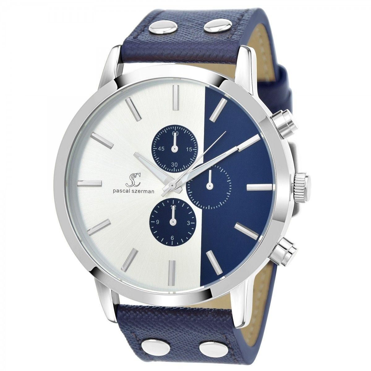 Montre homme par Pascal SzermanLargeur cadran : 52mm - Hauteur cadran : 52mm - Epaisseur : 11mmBracelet cuir bleu - Longueur : de 19 à 24cm - Largeur : 24mm - Fermoir : Boucle ardillonCompteurs décoratifs non fonctionnels.Matière : LaitonFinition : Plaquage haute résistanceVerre minéralMouvement Qua