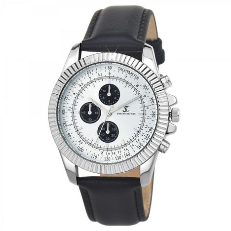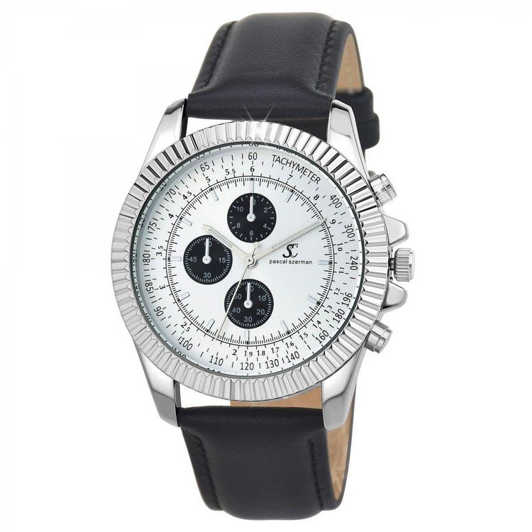 Montre homme par Pascal SzermanLargeur cadran : 42mm - Hauteur cadran : 42mm - Epaisseur : 11mmBracelet cuir noir - Longueur : de 17 à 22cm - Largeur : 21mm - Fermoir : Boucle ardillonCompteurs décoratifs non fonctionnelsMatière : LaitonFinition : Plaquage haute résistanceVerre minéralMouvement Quar