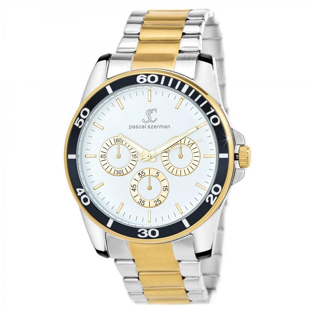 Montre homme par Pascal SzermanLargeur cadran : 46mm - Hauteur cadran : 46mm - Epaisseur : 12mmBracelet acier argenté et doré - Longueur : ajustable jusqu' à 26cm - Largeur : 22mm - Fermoir : Boucle déployante doubleCompteurs décoratifs non fonctionnelsMatière : LaitonFinition : Plaquage haute résis