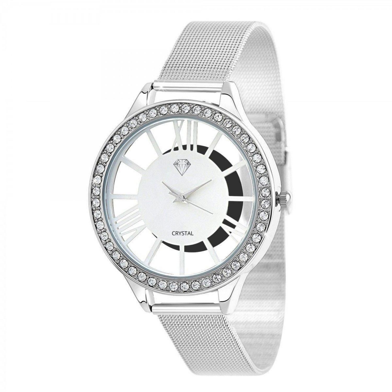Montre ornée de 48 Cristaux scintillants par SC CrystalLargeur cadran : 42mm - Hauteur cadran : 50mm - Epaisseur : 12mmBracelet métal argenté - Longueur : de 17 à 21cm - Largeur : 16mm - Fermoir : ClipMatière : LaitonFinition : Plaquage haute résistanceVerre minéralMouvement Quartz haute fiabilité