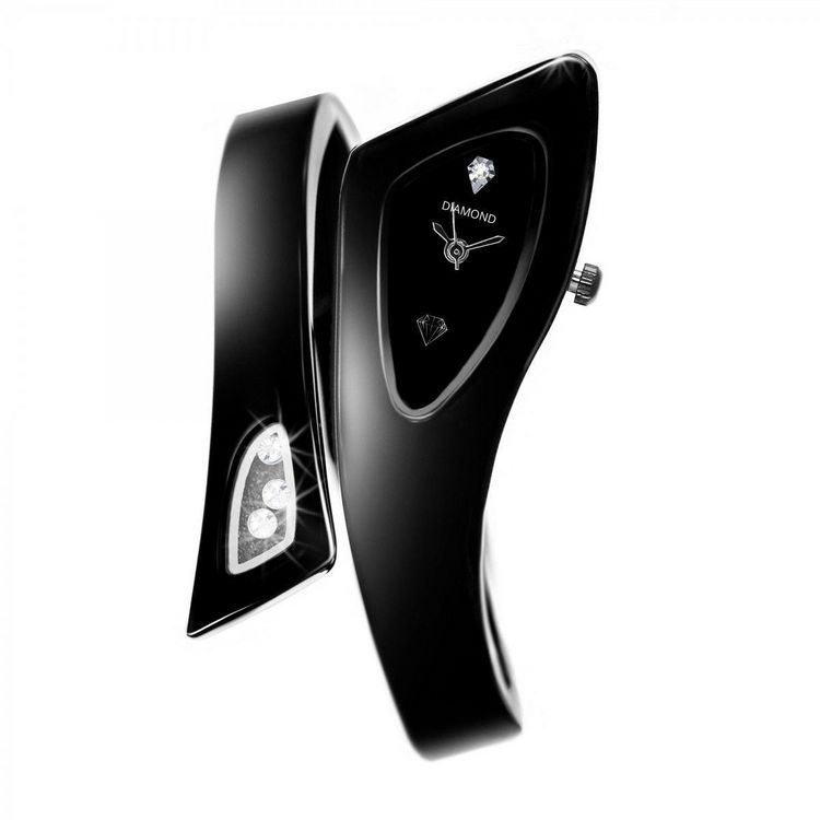 Avec son design noir épuré et son éclat royal, cette montre bangle noire ornée d'un véritable diamant confère une allure de pure élégance. La silhouette chic utilise des courbes fluides et des surfaces scintillantes pour créer une pièce moderne, luxueuse et très féminine. Magnifiquement modelé, ce design ultra féminisé et unique est agrémenté d'un mouvement Quartz haute fiabilité japonais qui tourne autour du cadran orné de 3 Cristaux scintillants. Le design réunit un boîtier totalement fermé avec le bracelet en métal noir, et un cadran noir scintillant.