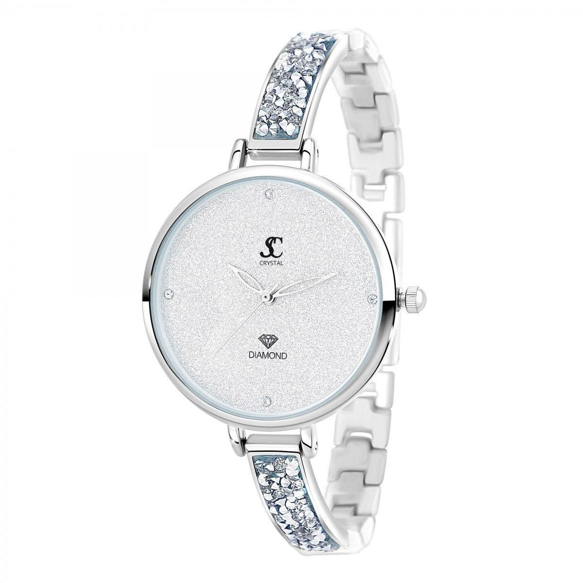 Montre ornée de 4 Cristaux scintillants par SC CrystalLargeur cadran : 35mm - Hauteur cadran : 35mm - Épaisseur : 10mmBracelet métal argenté - Longueur : de 15 à 19cm - Largeur : 8mm - Fermoir : ClipMatière : LaitonFinition : Plaquage haute résistanceVerre minéralMouvement Quartz haute fiabilité ja