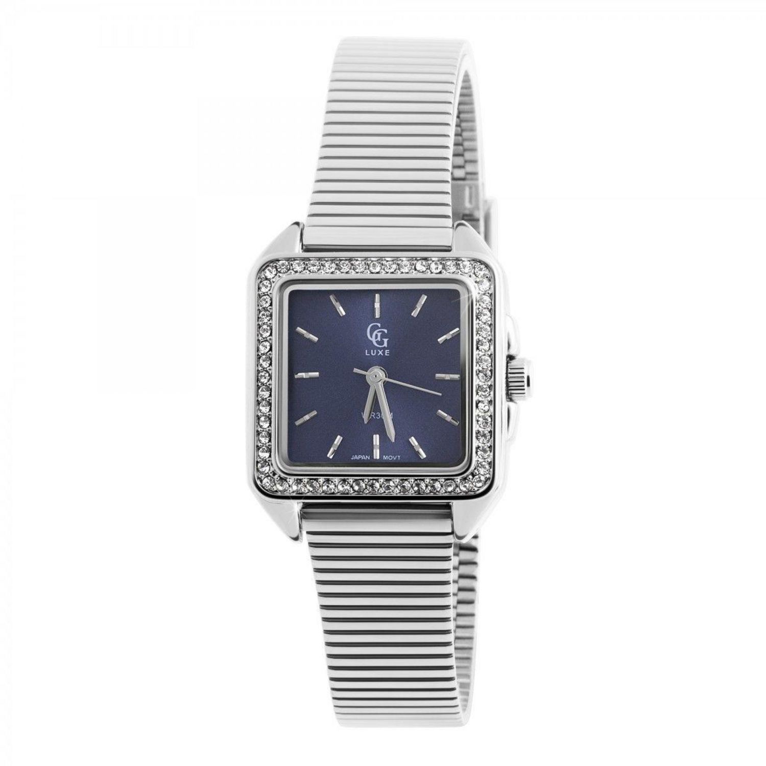 Montre femme ornée de Cristaux scintillantsLargeur cadran : 29mm - Hauteur cadran :34mm - Epaisseur : 8mmBracelet métal argenté - Longueur : ajustable jusqu' à 21cm - Largeur : 15mm - Fermoir : ClipMatière : LaitonFinition : Plaquage haute résistanceVerre minéralMouvement Quartz haute fiabilité japo