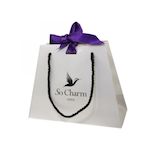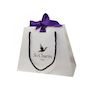 Sac blanc avec poignée en ficelle noire et ruban violet.Dimensions : 23 x 18 x 9 cm