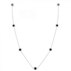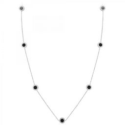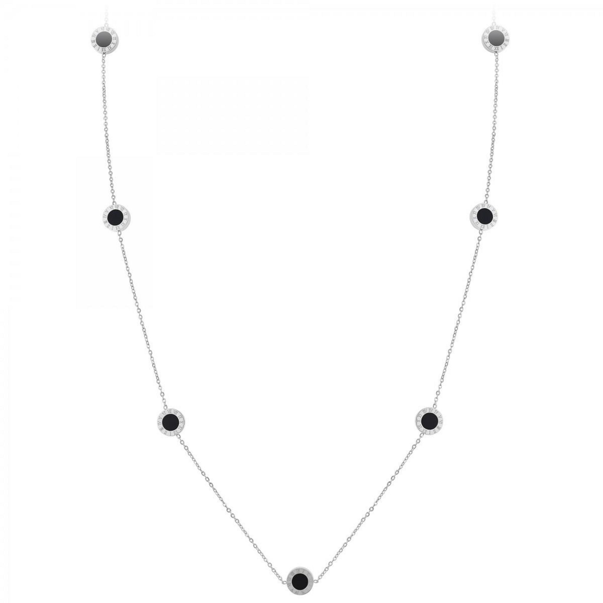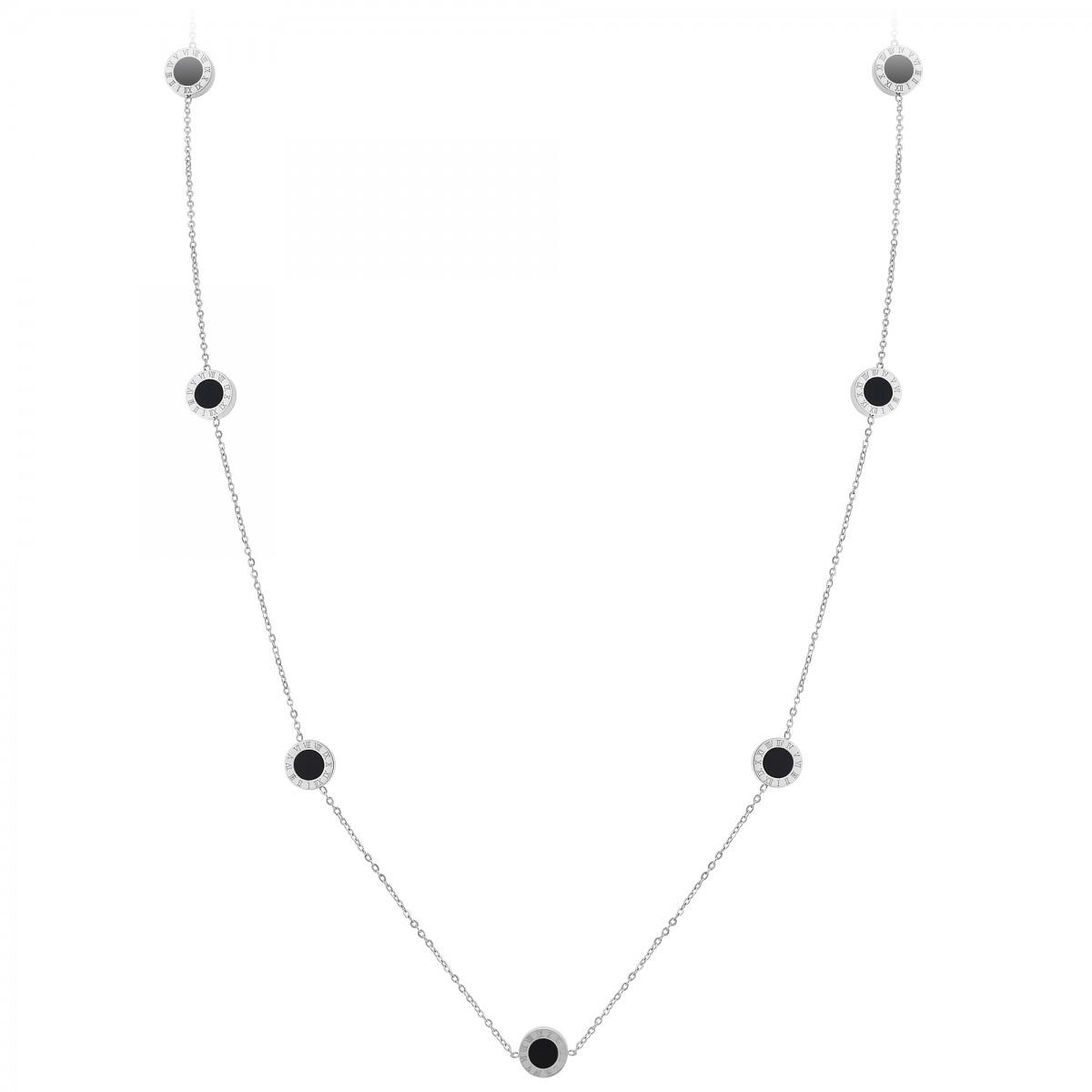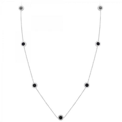 Sautoir SC CrystalAcier inoxydable.Ronds réversibles : une face nacrée blanche et une face noireLongueur collier : 91cm (+5cm de rallonge)Dimensions pendentifs : 10x10mmFermoir à mousqueton.