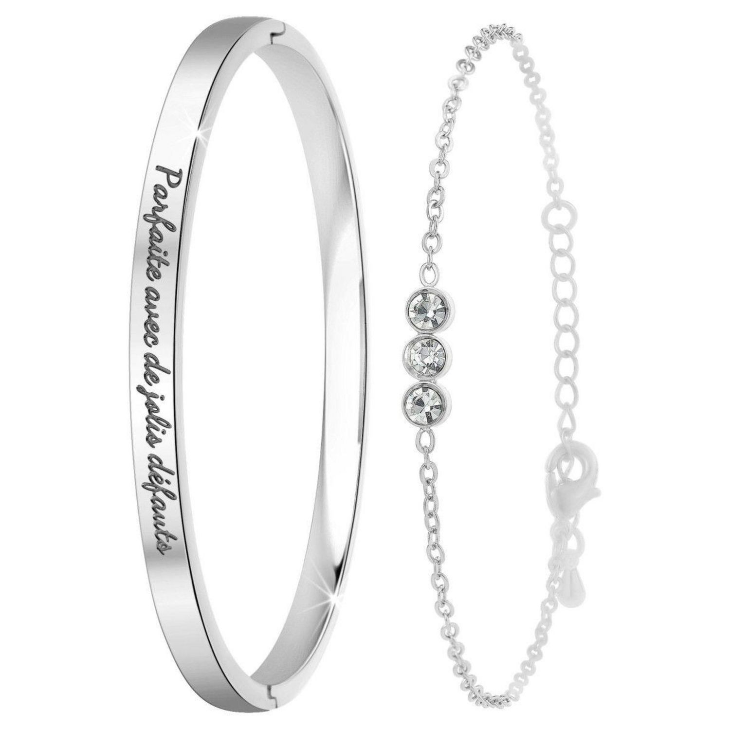 Bracelet Parfaite avec de jolis défauts et son bracelet SC Crystal® orné de cristauxBracelet SC CrystalAcier inoxydable.Diamètre : 60x50mmLargeur bracelet : 6mmBracelet SC Crystal® orné de cristauxAlliage résistant avec plaquage haute résistance.Dimensions pendentif : 12x3mmLongueur bracelet : 16c