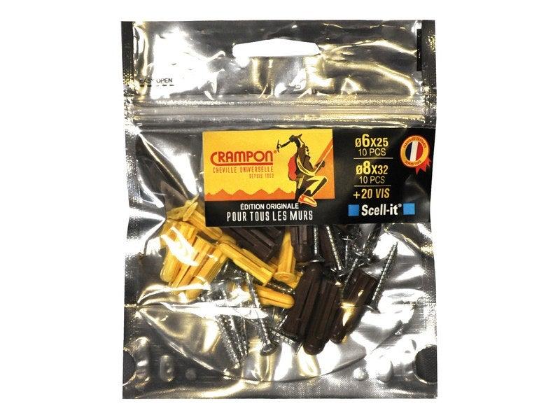 - Composition du kit: 10 chevilles universelles Crampon 6x25 et 10 chevilles universelles Crampon 8x32 dégrappées + 20 vis