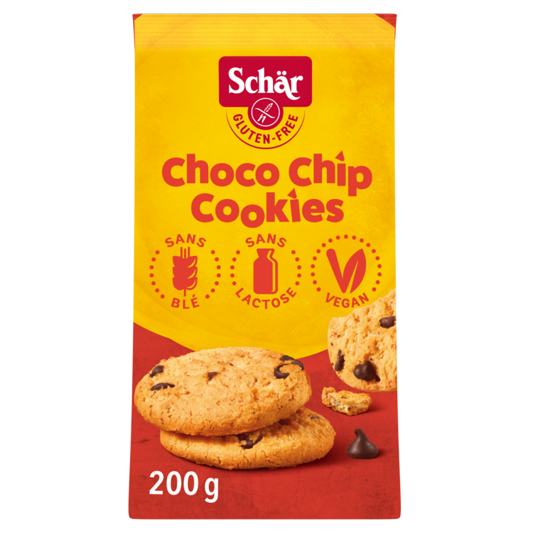 Le Choco Chips Cookie sans gluten Schär est un biscuit aux délicieuses pépites de chocolat. Idéal pour accompagner vos pauses gourmandes. Sans blé, sans conservateurs.