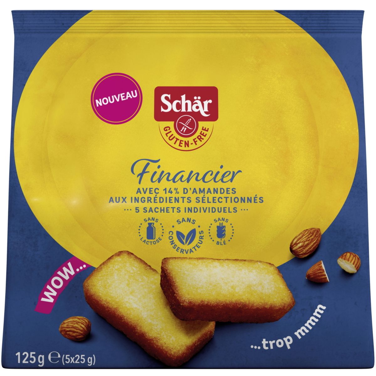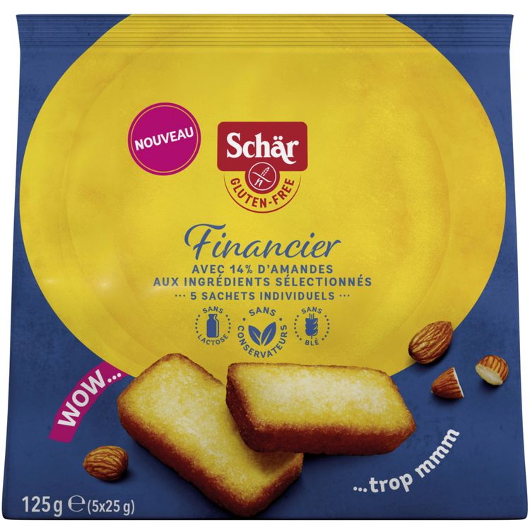 Découvrez le traditionnel Financier sans gluten Schär. Une texture moelleuse avec 14% d'amandes . Portions individuelles idéales pour une consommation hors domicile et pour tous les moments de la journée. Sans conservateurs et sans lactose