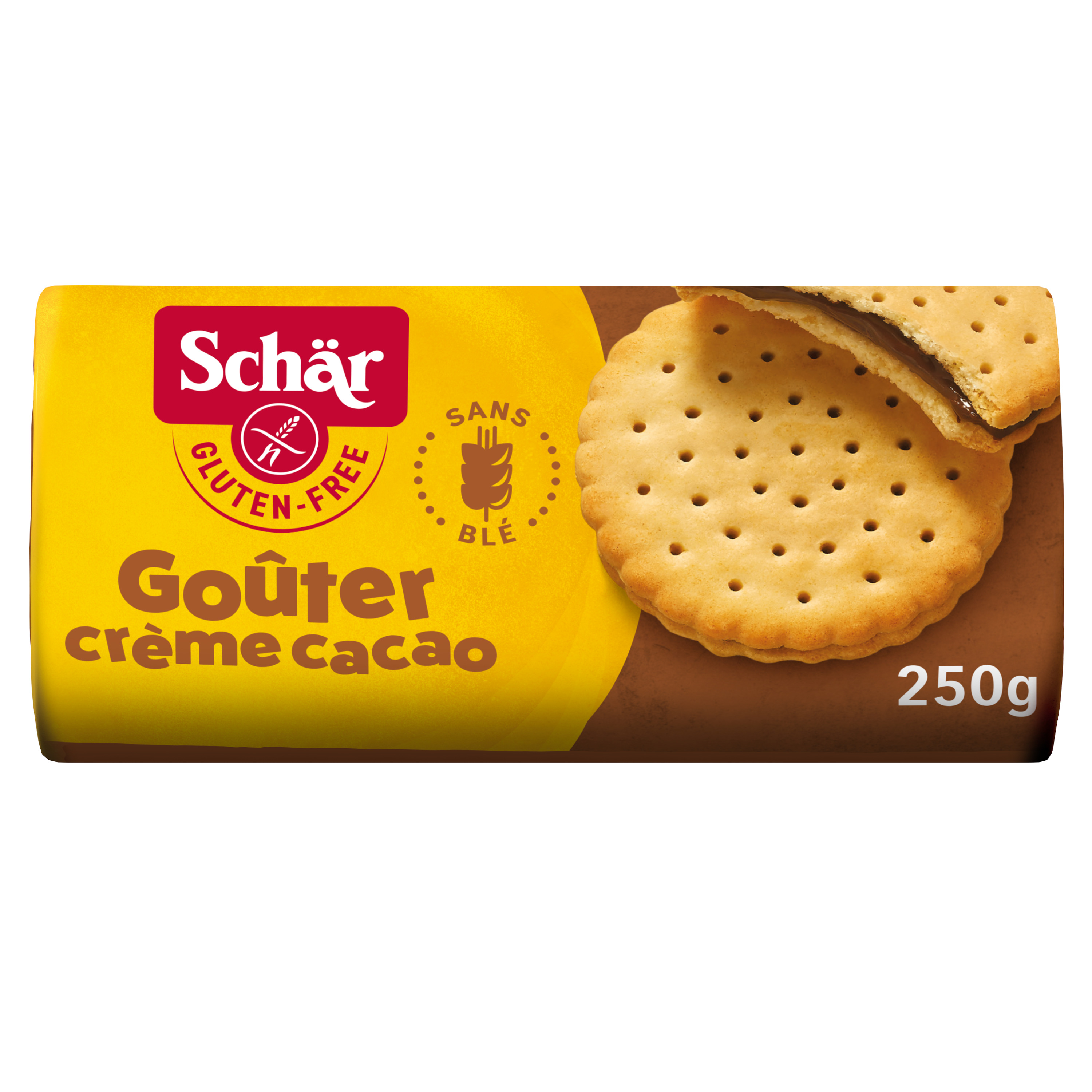 Le Goûter crème cacao sans gluten Schär est un biscuit délicieusement fourré à la crème cacao. Il sera un indispensable pour toutes vos pauses gourmandes ou pour vos petits-déjeuners. Sans blé, sans conservateurs.