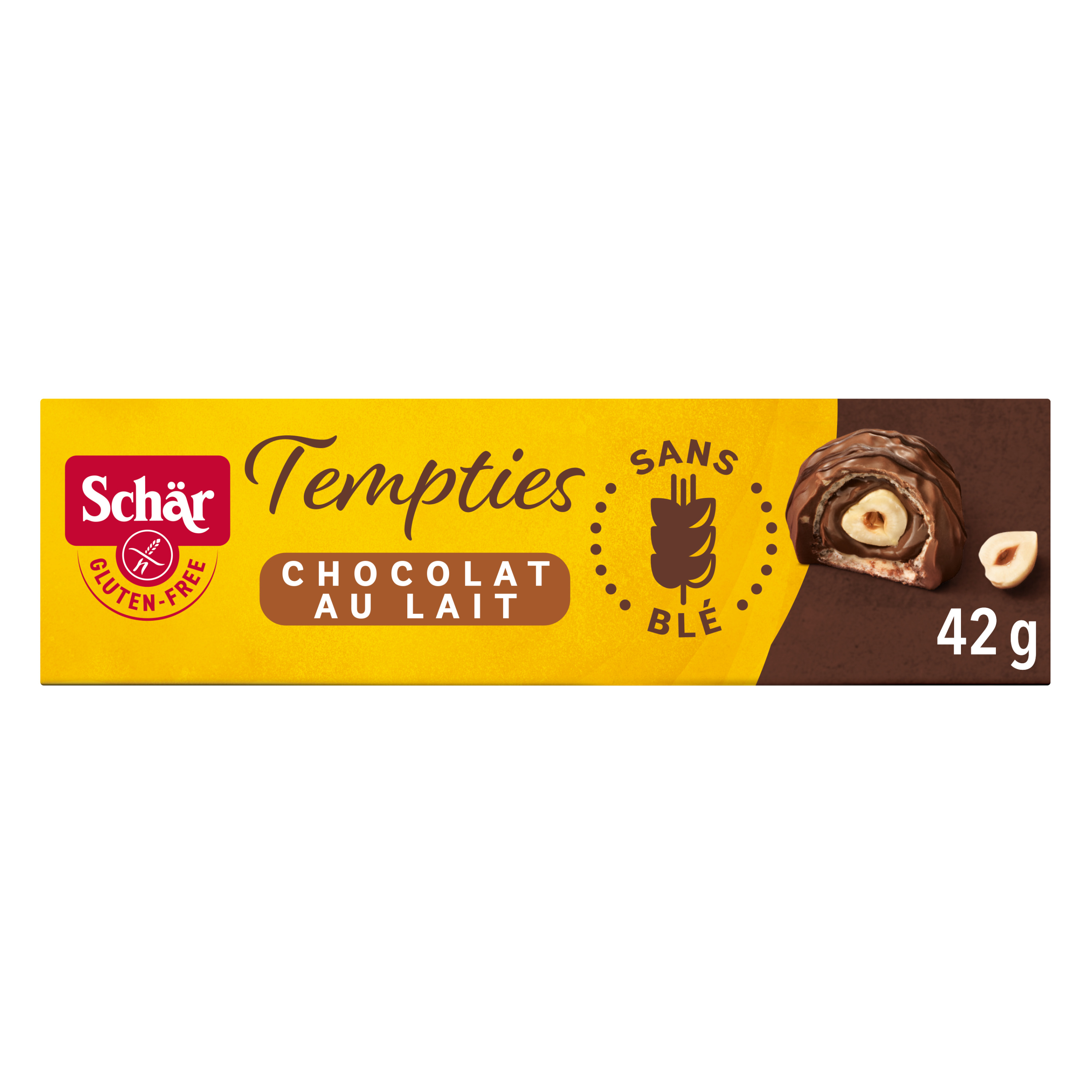 Découvrez les Tempties sans gluten Schär. Une irrésistible bouchée chocolatée avec une noisette entière à l'intérieur pour satisfaire tous les gourmands ! Emballage individuel pratique, parfait pour une pause gourmande ! Sans blé, sans conservateurs.