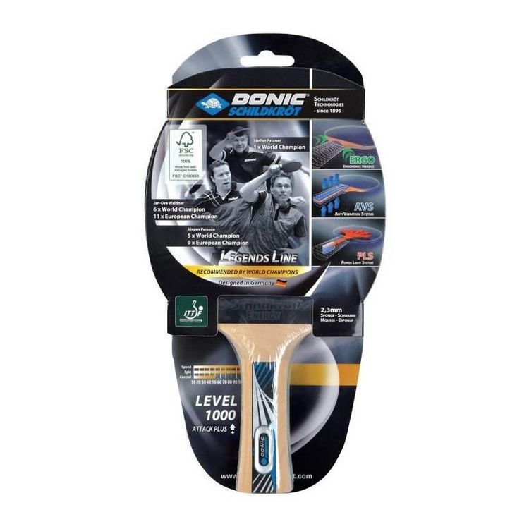 Legends 1000 FSC: adhérence, puissance, confort haut de gamme. Revetement ENERGY, éponge 2,3 mm, grip ERGO pour transmission optimale des effets, vitesses de balle rapides. Technologies PLS et AVS réduisent vibrations. Donic-Schildkröt privilégie bois certifié FSCTM, Donic en compétition, Schildkröt en loisir.