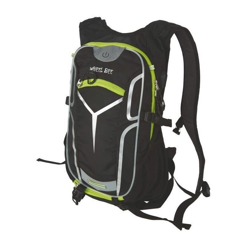 Le sac à dos Wheel Bee BIKE BACKPACK Stelvio intègre une LED verte haute visibilité avec 3 modes (continu, clignotement lent/rapide) et des bandes réfléchissantes pour une sécurité maximale de jour comme de nuit. Son système d'éclairage breveté fonctionne avec 2 piles CR2032 incluses, offrant jusqu'à 200 heures d'autonomie.