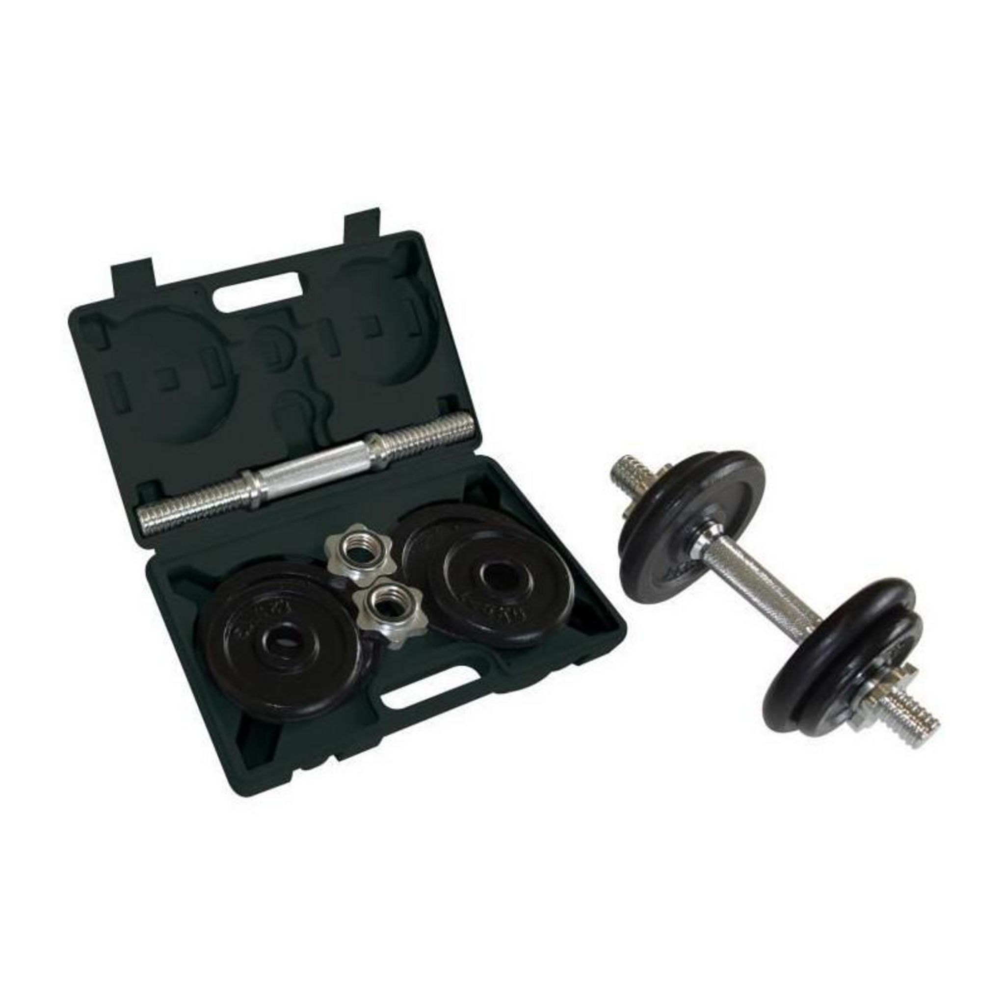 Ensemble d'halteres comprenant des plaques d'halteres en fonte, une barre d'halteres chromée avec fil de sécurité (longueur 30 cm) et deux fermetures étoiles avec anneau de verrouillage en caoutchouc. Poids: deux plaques de poids de 2,5 kg, deux plaques de poids de 1,25 kg. Dans une boîte refermable