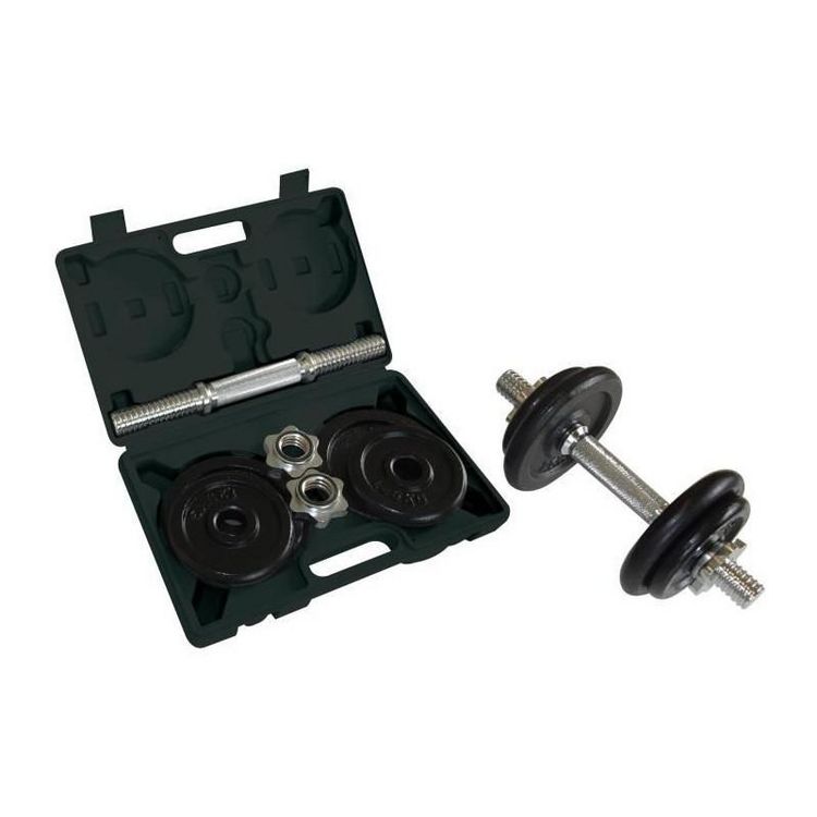 Ensemble d'halteres comprenant des plaques d'halteres en fonte, une barre d'halteres chromée avec fil de sécurité (longueur 30 cm) et deux fermetures étoiles avec anneau de verrouillage en caoutchouc. Poids: deux plaques de poids de 2,5 kg, deux plaques de poids de 1,25 kg. Dans une boîte refermable pratique avec poignée de transport. L'entraînement avec halteres.
