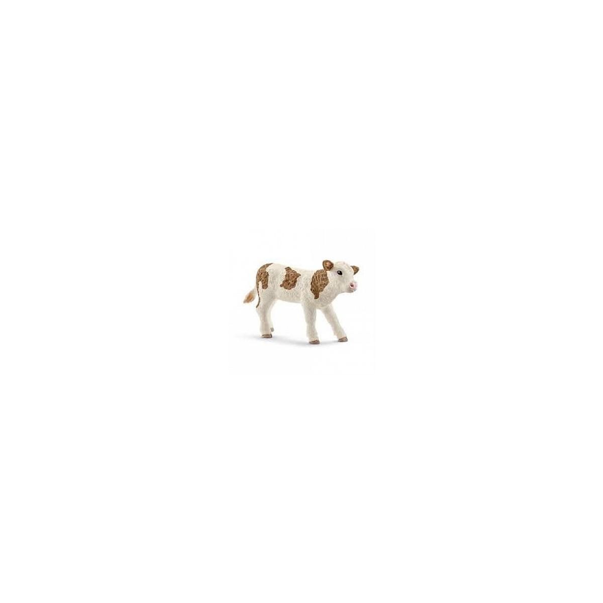 La figurine du veau Simmental de Schleich (réf. 13802) est une reproduction fidèle de cette race bovine suisse. Mesurant environ 6 cm de long, elle est peinte à la main avec des détails réalistes, mettant en valeur la robe blanche tachetée de brun caractéristique de la race. Fabriquée en plastique d