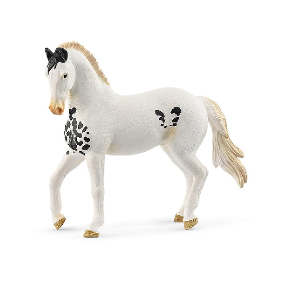 Avec sa crinière bicolore, le fier Étalon Marwari attire tous les regards. Il a une robe blanche comme neige, à l'exception de quelques taches noires sur son poitrail et ses flancs. Son toupet noir tombe sur son front entre ses oreilles noires recourbées. La ressemblance avec le Poulain Marwari au p