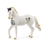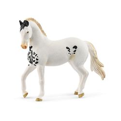 Avec sa crinière bicolore, le fier Étalon Marwari attire tous les regards. Il a une robe blanche comme neige, à l'exception de quelques taches noires sur son poitrail et ses flancs. Son toupet noir tombe sur son front entre ses oreilles noires recourbées. La ressemblance avec le Poulain Marwari au pelage également tacheté est évidente.