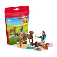 Le Chien de Rhodésie est ravi de pique-niquer avec Lisa. Tous deux sont confortablement installés sur la couverture. Lisa tend le délicieux os à son chien. Pour elle, elle a apporté de la tarte aux pommes. Mais le malin petit écureuil n'en aura pas ! Elle boit une gorgée de sa gourde et verse de l'e