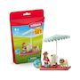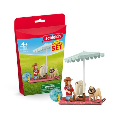 Hannah va se baigner au lac accompagnée de son carlin. Elle ouvre son grand parasol et déploie sa couverture moelleuse. Par mesure de précaution, elle met la laisse autour du cou de son chien. Elle sort ensuite la bouteille d'eau de son sac à dos. Oh, mais qu'est-ce que c'est ? Elle allait presque oublier de sortir le ballon de plage ! Hannah et son chien pourront s'amuser avec dans l'eau.