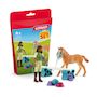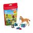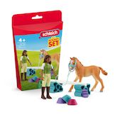 Sarah a prévu tout plein d'activités avec le Poulain Tennessee Walker. Elle a installé les équipements d'entraînement dans le paddock. La barre de saut est déjà fixée sur le cavaletti. Sur le sol, elle a posé trois repères. La petite fille conduit son poulain par le licol jusqu'au terrain d'entraînement. Tous les champions doivent bien commencer un jour !
