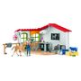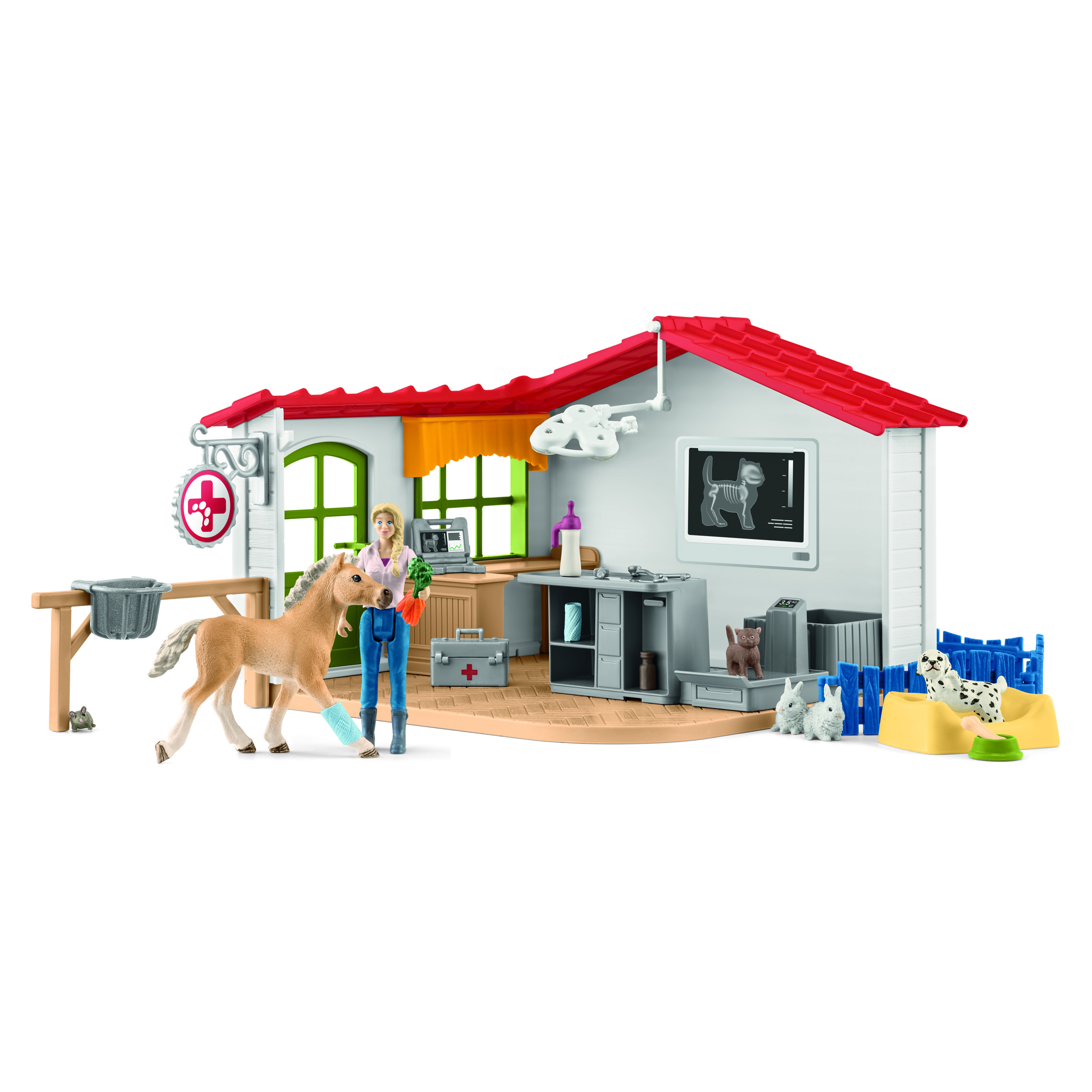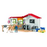 Au cabinet vétérinaire de Schleich® Farm World, tous les patients animaux sont traités et soignés avec amour. Pour cela, ils peuvent compter sur la vétérinaire. Elle a toujours le bon équipement à disposition. À l’aide de la radiographie au mur, elle peut traiter ses patients sur la table d’examen et sortir rapidement le bon médicament de sa malette. Avec le pèse-personne, la vétérinaire peut vérifier le poids des lapins qui peuvent récupérer rapidement sur l'herbe dans l'enclos. Voilà déjà le prochain patient !