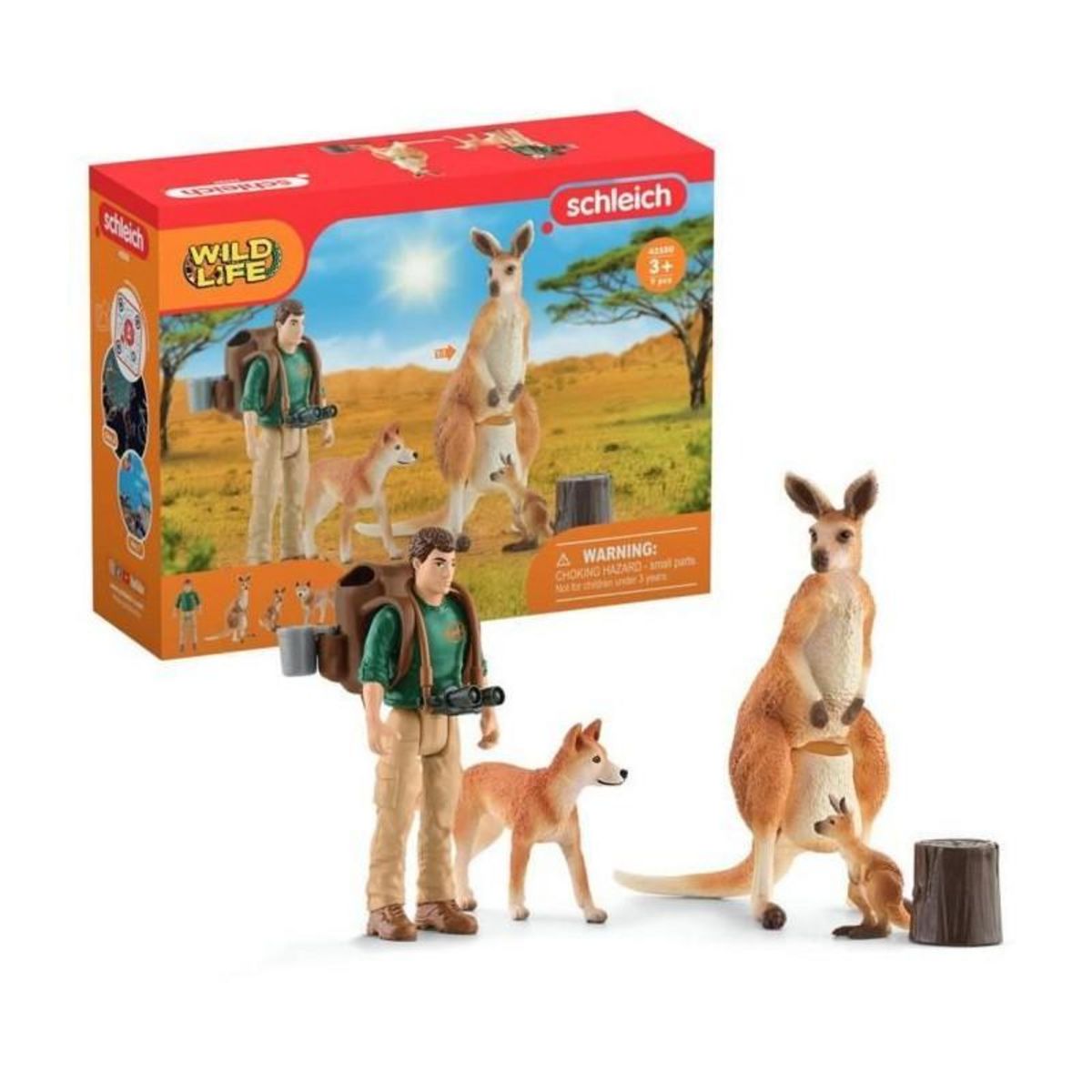- Figurines détaillées et colorées représentant un kangourou adulte, un bébé kangourou, Tom le ranger, et un dingo.