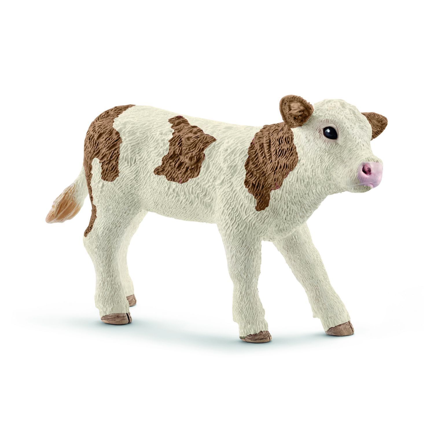 La figurine du veau Simmental de Schleich (réf. 13802) est une reproduction fidèle de cette race bovine suisse. Mesurant environ 6 cm de long, elle est peinte à la main avec des détails réalistes, mettant en valeur la robe blanche tachetée de brun caractéristique de la race. Fabriquée en plastique d
