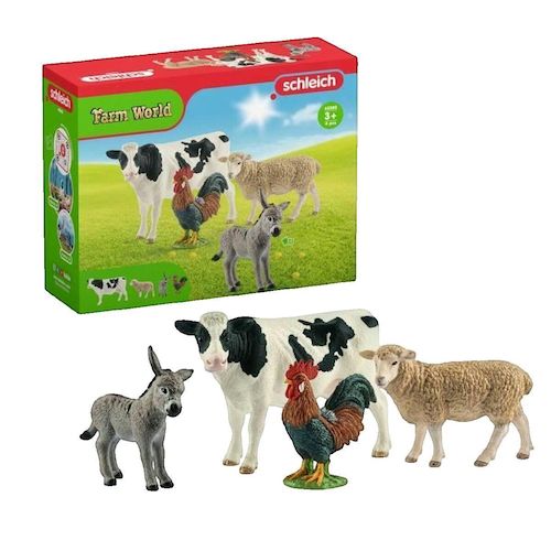 Le Kit de base Farm World de Schleich est un jouet éducatif comprenant des figurines d'animaux de la ferme telles qu'une vache, un mouton, un âne et un coq. Ce jeu encourage l'imagination et la créativité des enfants à partir de 3 ans. Fabriqué en plastique durable et léger, il offre des couleurs vi