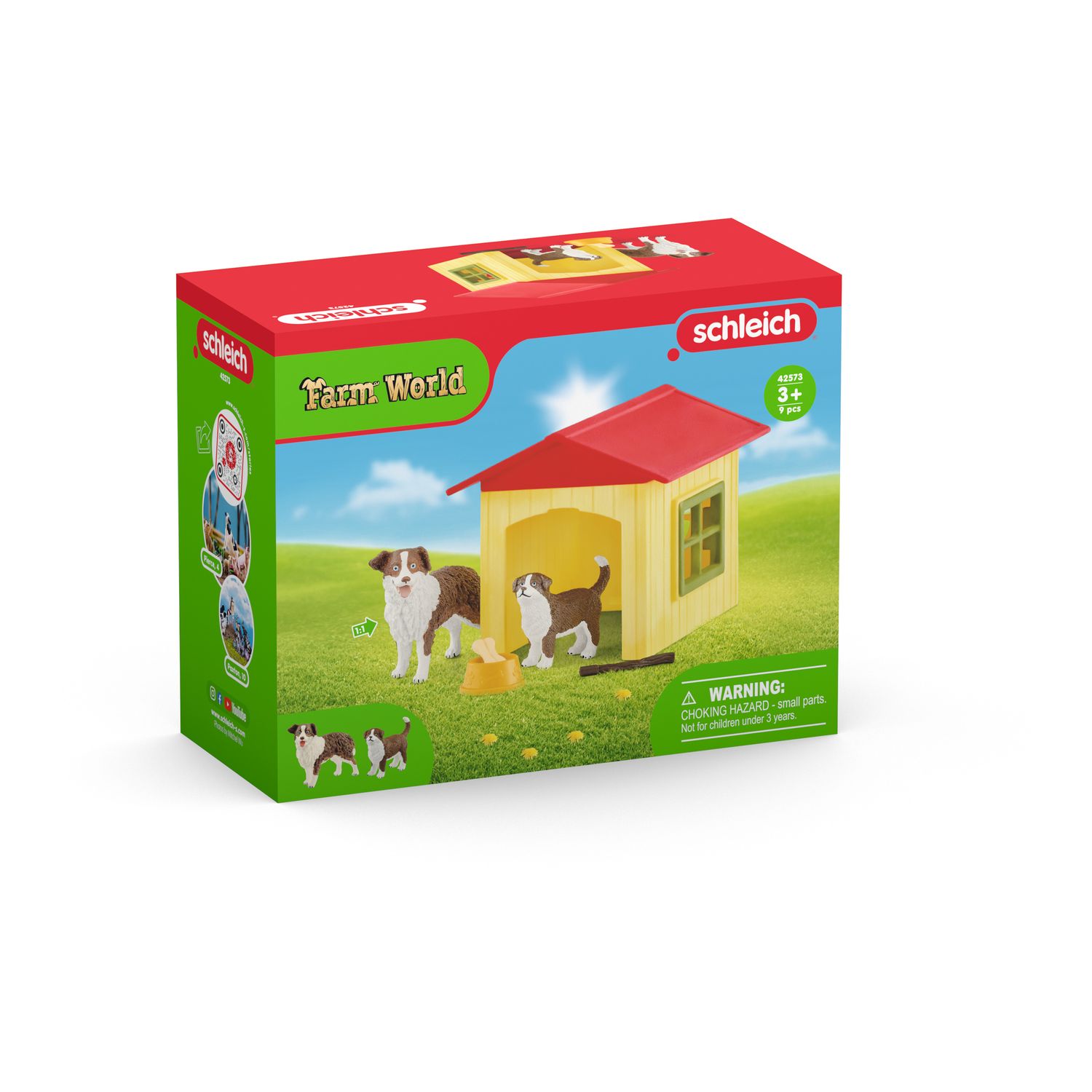 Ohhhhhh... Une maman Berger Australien et son bébé ! Après avoir aidé le fermier à rassembler les moutons, ces chiens courageux sont prêts pour une sieste dans la niche aux couleurs vives. Le coffret de jeu Niche pour chien est livré avec deux chiens et leur niche, un os, une gamelle et un bâton pour amuser le chiot. Qu’il pleuve ou qu’il fasse beau, la Niche pour chien est on ne peut plus confortable !
