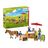 En savoir +Ben FW et sa mere Laura chargent l'étal mobile de la ferme FARM WORLD de Schleich® de produits frais venant tout droit de leur ferme. La charrette transporte des pommes juteuses, des oeufs fraîchement pondus, de la salade croquante, des pommes de terre cueillies dans le champ, du lait de vache refroidi et du pain croustillant. Une fois qu'ils ont tout chargé, ils attellent l'infatigable poney Poppy a la charrette et l