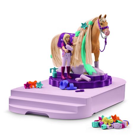 Tu voudras passer des heures à mettre en beauté ton cheval avec la Station de soins pour chevaux ! Le Beauty Horse adore se faire caresser avec les différentes brosses et l’éponge. Avec le sèche-cheveux dans le tiroir, tu pourras sécher plus rapidement la crinière et la queue. Le coiffage peut alors commencer. Perles, nœuds, fleurs : tu peux t’en donner à cœur joie dans, et même ajouter une mèche supplémentaire. Pour montrer au monde entier qu’ils s’entendent à merveille, le cheval et la cavalière arborent un look assorti : la couverture pour cheval et le gilet ont le même motif, tandis que les guêtres s’accordent avec le bracelet.