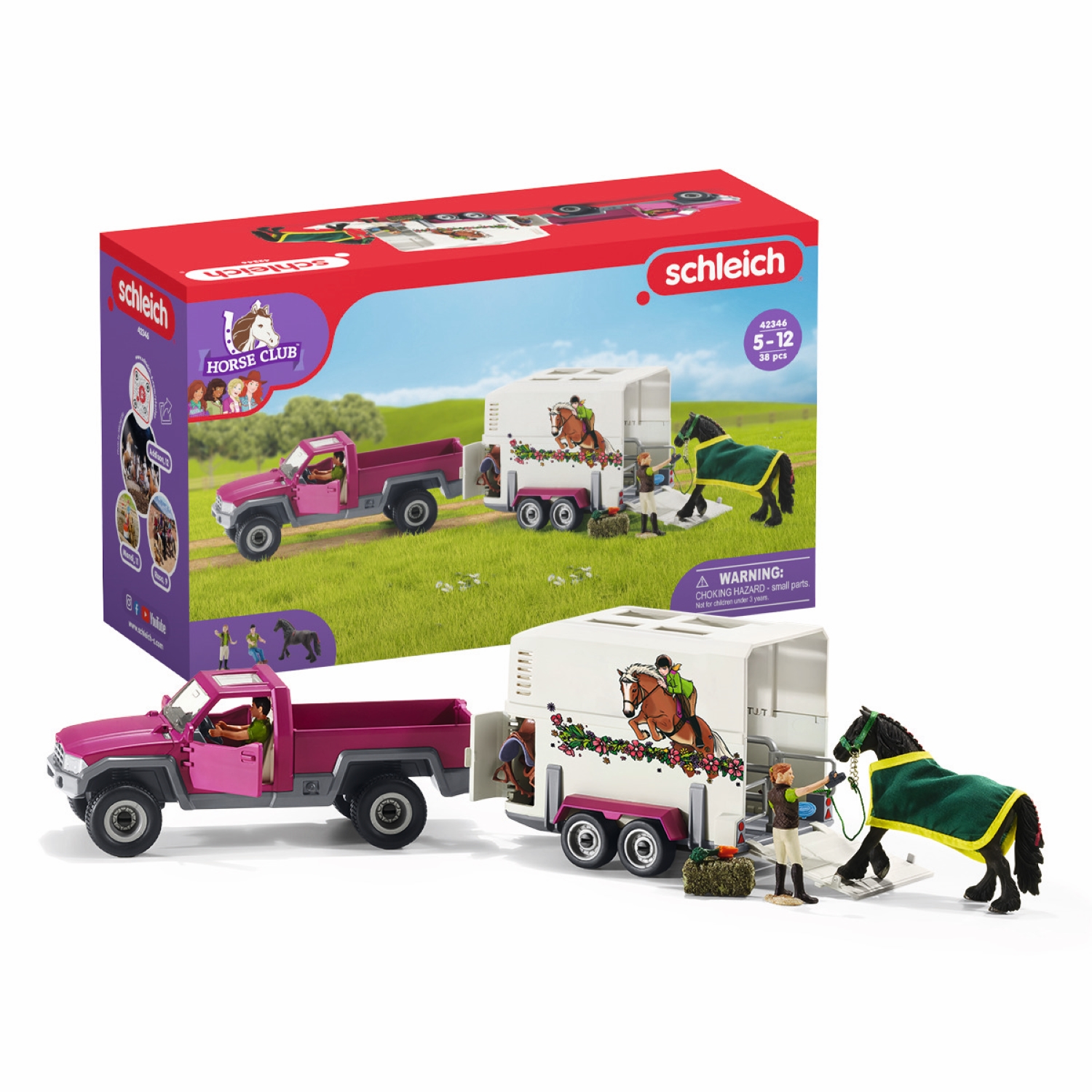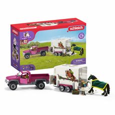 Betty, la soigneuse de chevaux, étrille encore soigneusement la jument frison Bella car elle sait que cette dernière adore cela. Le cheval sent qu'il se passe quelque chose de spécial aujourd'hui. Et c'est bien vrai : Bella est transportée dans la nouvelle écurie. Après l'avoir bien pansée, Betty, la guide prudemment dans la remorque spacieuse. Bien que Bella soit de nature calme et paisible, toute cette activité l'agite un peu. Betty monte ensuite dans le pick-up pour sortir lentement de la cour. La jument se retourne avec curiosité pour voir où on l'emmène. Elles seront bientôt arrivées dans la nouvelle écurie et Bella pourra commencer par visiter l'enclos.