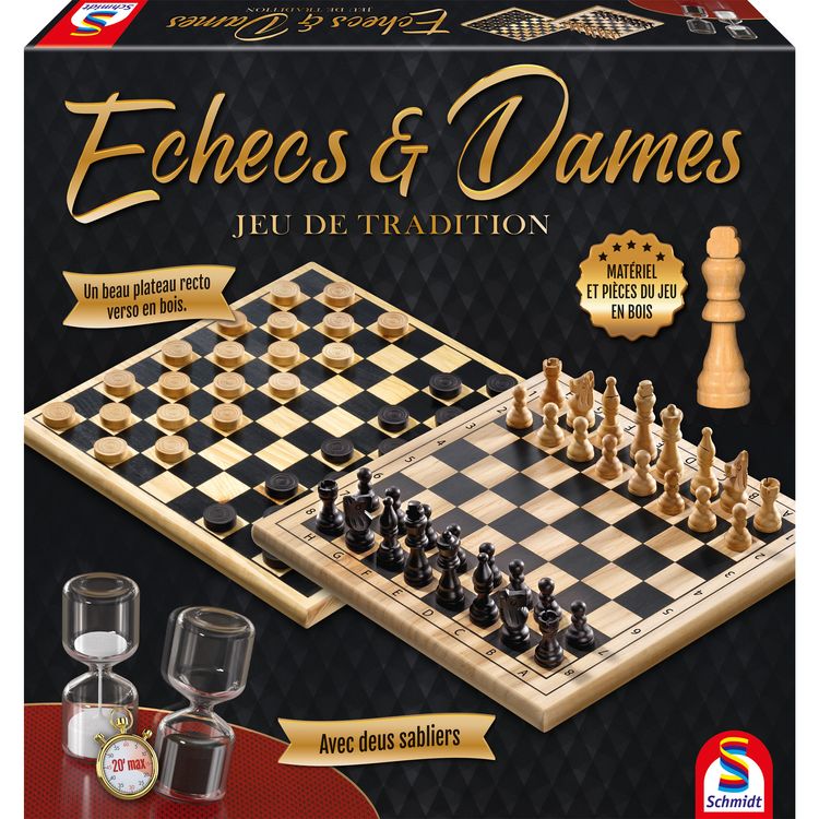 jeu d’échecs et dames avec un beau plateau recto verso accompagné de pièces en bois et d’un sablier pour des parties plus intenses.