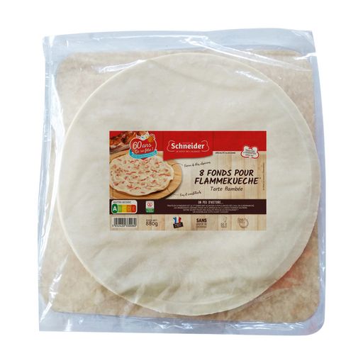 Pour une recette traditionnelle : Etalez 2 bonnes cuillères de garniture crème Traiteur Schneider. Garnissez de lardons allumettes fumés et de rondelles d'oignons frais. Mettez au four préchauffé à 250°C environ 5 min