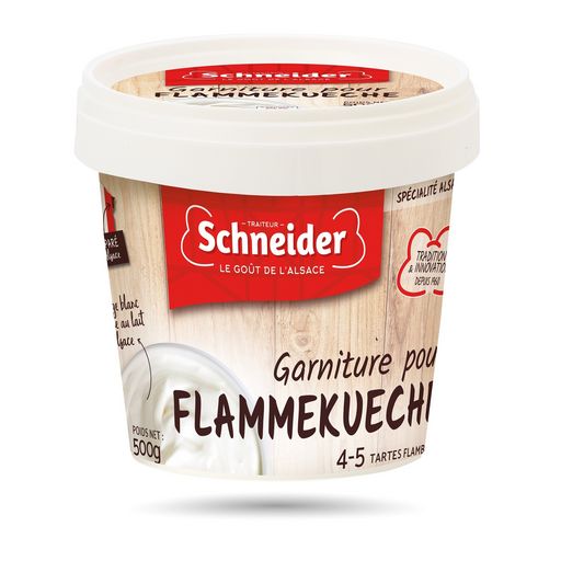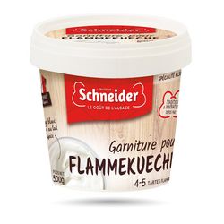 LA GARNITURE EST UNE CREME A ETALER SUR LES FONDS DE TARTE FLAMBEE AVEC DES LARDONS ET DES OIGNONS EMINCES. A ENFOURNER DANS UN FOUR TRES CHAUD 5 A 7 MINUTES.