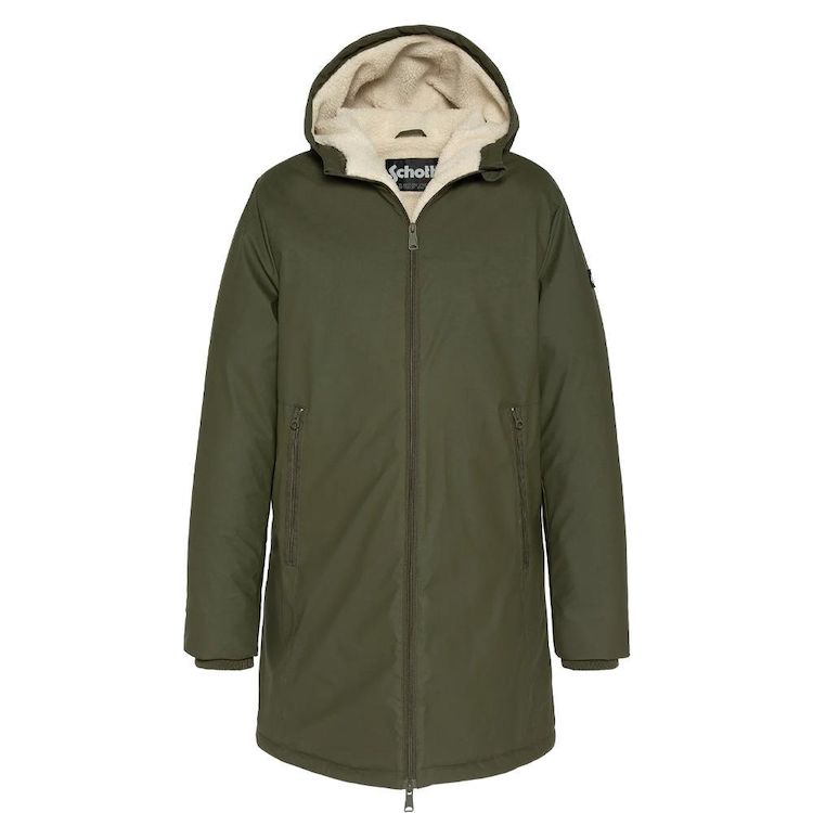 Coupe-vent long à capuche doublé sherpaColoris : Vert Capuche fixe doublée polaireFermeture zippée double curseur2 poches basses zippées & 1 poche intérieure à scratchBadge logo Schott NYC® manche gaucheFinition bord côte poignetsCoupe : standardComposition : 100% Polyester