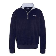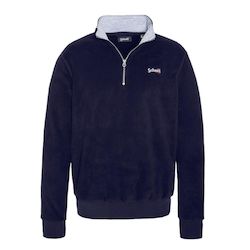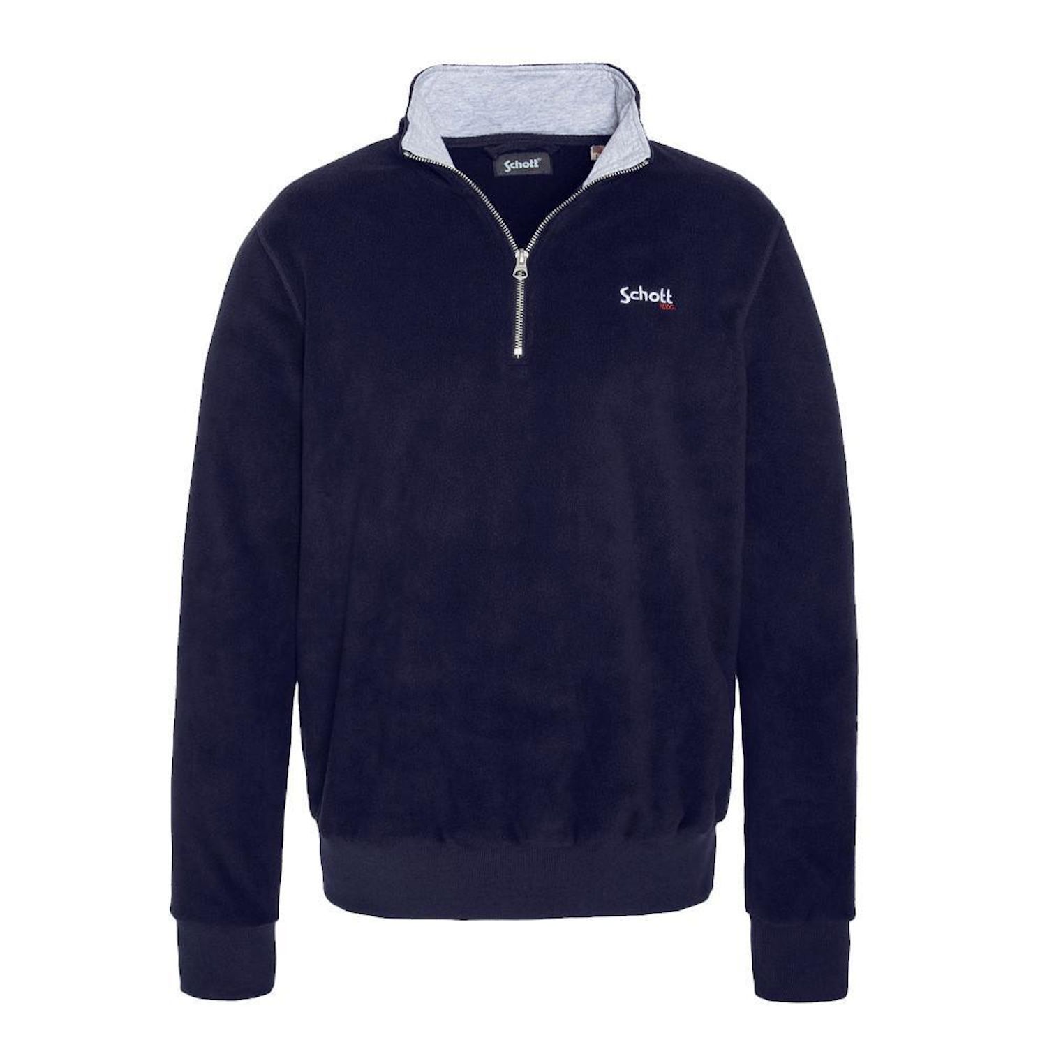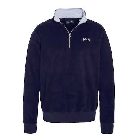 Optez pour ce sweat homme de la marque Schott ! Couleur : Marine Coupe altique Col 1/4 zip Broderie Schott sur la poitrine Manches longues Composition : 100% polyester