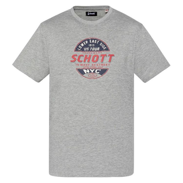 Découvrez ce t-shirt de la marque Schott !Couleur : GrisCoupe altiqueCol rondManches courtesImprimé sur la poitrineComposition : 100% coton