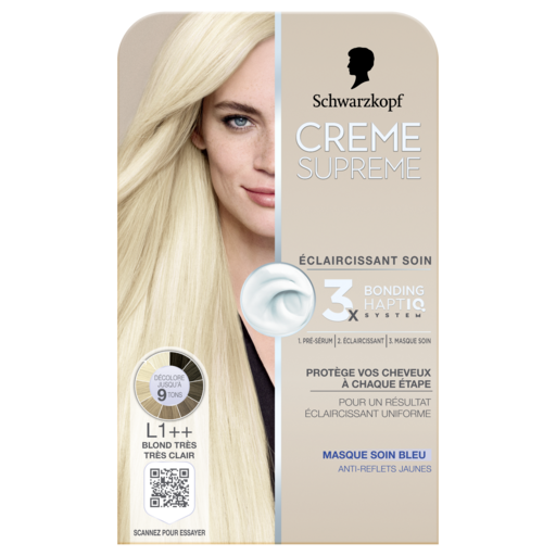 La coloration crème soin de Schwarzkopf. La coloration en 3 étapes prend soin de vos cheveux pour un résultat éclaircissant uniforme. Pré-sérum soin intense prépare parfaitement les cheveux pour la coloration. Cette coloration protège vos cheveux tout en colorant uniformément grâce au masque soin bleu. La formule du soin incluant le système HaptIQ prend soin de vos cheveux: en créant de nouvelles micro-liaisons capillaires et égalise les zones fragilisée. ISSUE DES LABORATOIRES SCHWARZKOPF Une couleur permanente qui ne s'estompe pas.