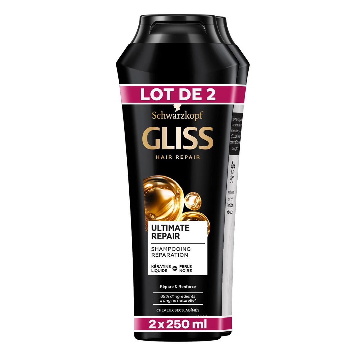 Un manque de kératine peut affaiblir la fibre capillaire et abîmer vos cheveux. La gamme ULTIMATE REPAIR comble les pertes en kératine, répare de façon ciblée les zones très abîmées de la fibre capillaire et apporte résistance et brillance aux cheveux. GLISS ULTIMATE REPAIR Ce shampooing est conçu pour laver les cheveux en douceur. Sa formule, composée de 89 % d'ingrédients d'origine naturelle *, est enrichie en KÉRATINE LIQUIDE, protéine protectrice, et en PERLE NOIRE, riche en oligo-éléments. Les 11 % restants participent principalement à la sensorialité et la bonne conservation du produit. Les formules GLISS, aux ACTIFS CAPILLAIRES RECONNUS, réparent les zones abîmées et répondent aux besoins spécifiques des cheveux pour les sublimer.