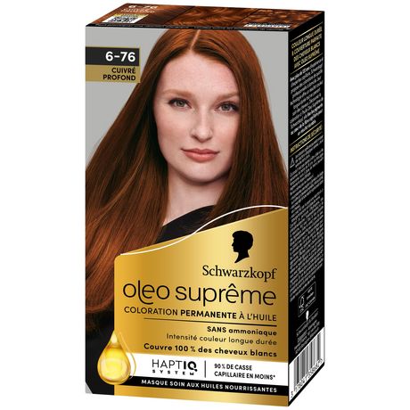La première coloration à l'huile permanente de Schwarzkopf. La formule de la coloration permanente Oleo Suprême à l'huile est SANS AMMONIAQUE, elle prend soin de vos cheveux et couvre 100 % des cheveux blancs. Une intensité couleur longue durée pour des cheveux fortifiés et éclatants. Le masque soin aux huiles nourrissantes redonne de la force aux cheveux et les rend visiblement plus beaux. ISSUE DES LABORATOIRES SCHWARZKOP La formule du soin incluant le système HaptIQ prend soin de vos cheveux en :1. Créant de nouvelles micro-liaisons capillaires dans le cheveu2. Enveloppant les cheveux d'un voile protecteur après la coloration3. Renforçant la chevelure pour 90 % de casse en moins* et pour un résultat couleur longue durée.HaptIQ – notre expertise pour des cheveux sublimés.* Test instrumental comparatif réalisé avant et après utilisation de la coloration.