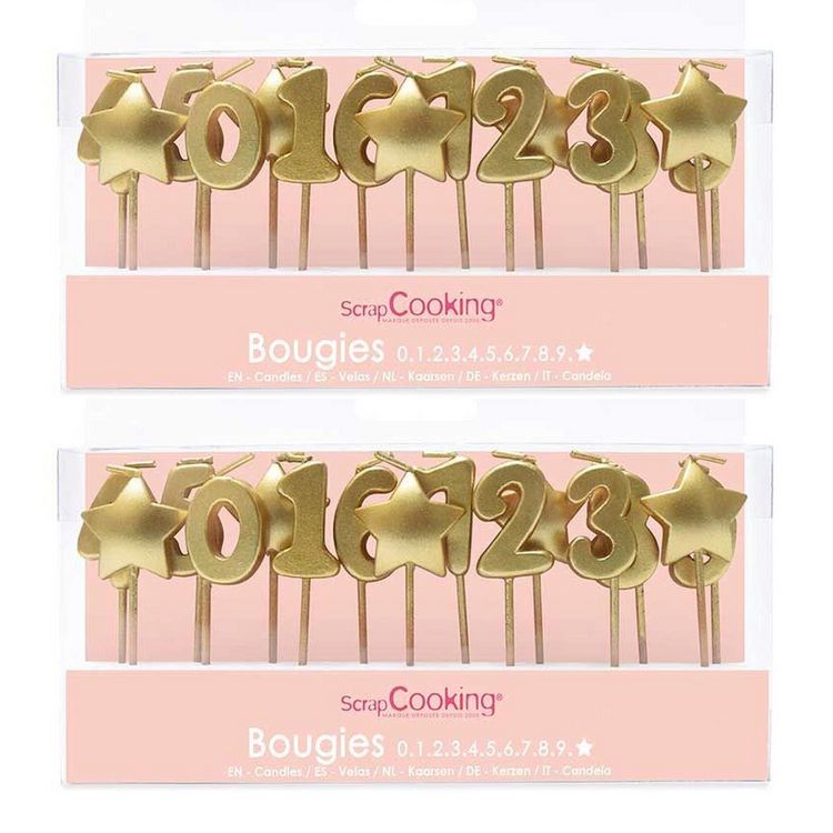 Ces 2 kits de 15 bougies en paraffine donneront une touche élégante à vos desserts d'anniversaire ! Elles conviennent pour tous les âges et leur couleur dorée s'adaptera parfaitement à vos créations ! Pour un anniversaire inoubliable, enfants comme adultes ! Le kit contient un assortiment de 15 bougies dorées en forme de chiffres de 0 à 9 et 5 bougies en forme étoiles. Elles sont en matière paraffine et les pics sont en bois aptes au contact alimentaire. Piquez les bougies sur votre gâteau en les espaçant de 2 à 3cm entre elles. Allumez-les pour créer une ambiance magique, puis soufflez pour les éteindre ! Pensez à éteindre la bougie avant qu'elle n'atteigne la bobèche afin d'éviter de l'endommager puis enlevez les éventuelles gouttes de cire sur le gâteau avant de le déguster. Dimensions des bougies sur pic : hauteur d'environ 8 cm. Attention, ce produit n'est pas un jouet, il est destiné à la décoration. Ne laissez pas les bougies sans surveillance, elle doivent être allumées en présence d'un adulte. Ne pas laisser des bougie à la portée des enfants, des animaux ou a proximité de matériaux inflammables.