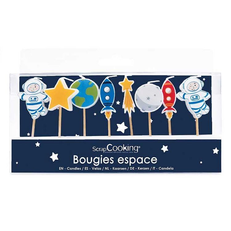 En savoir +Pour customiser un gâteau d'anniversaire sur le thème de l'espace, découvrez ces 8 bougies en paraffine inspirées de l'univers de l'espace. De magnifiques décorations pour donner un style spatial simplement! Ce kit contient 8 bougies variées contient : 2 bougies astronautes, 2 bougies fusées, une bougie étoile, une bougie en forme d'étoile filante et deux planètes. Simples d'utilisation, il vous suffira de les piquer sur votre gâteau et de les allumer pour créer la magie. Matière paraffine avec mèche. Les pics sont en bois apte au contact alimentaire. Dimensions des bougies : 8 cm.