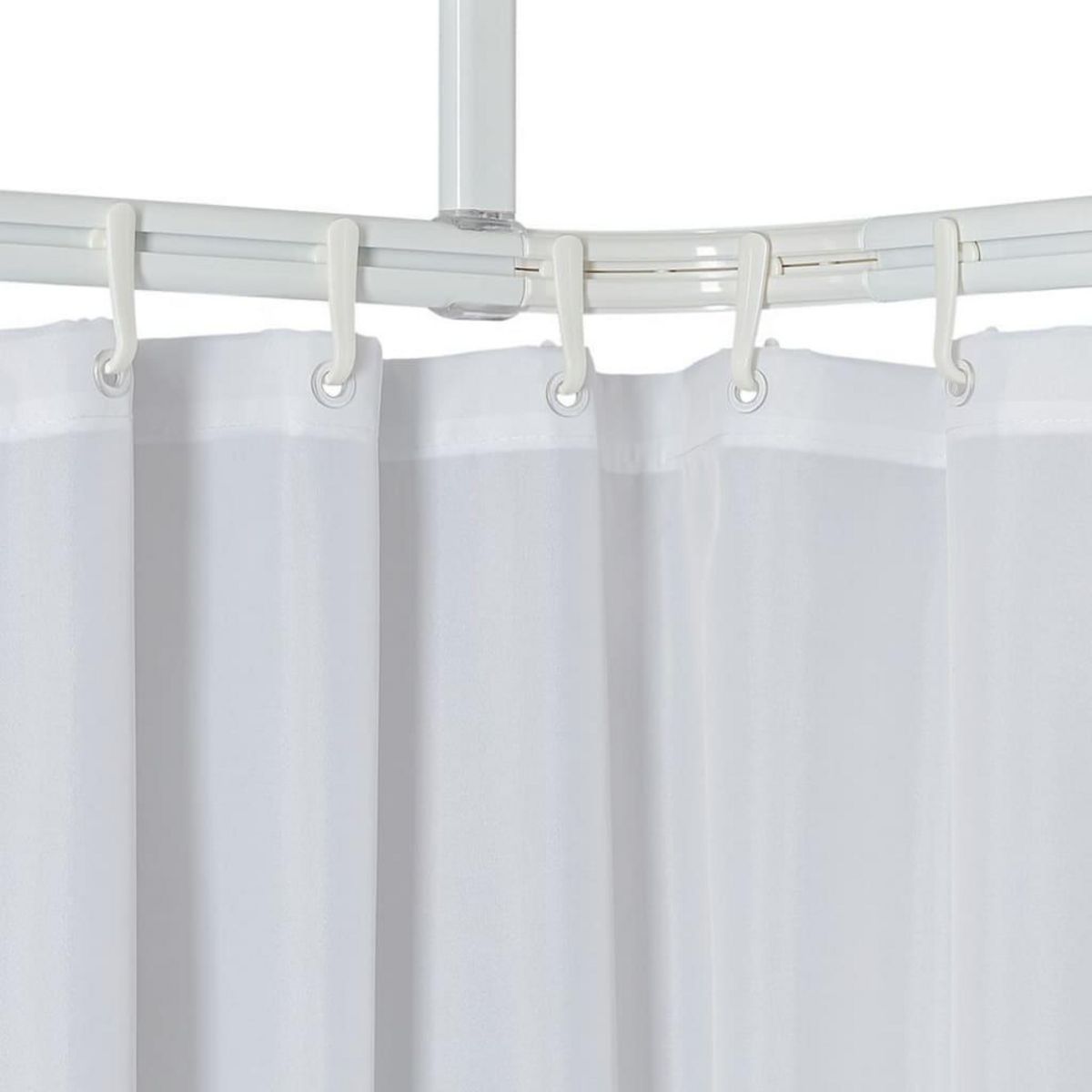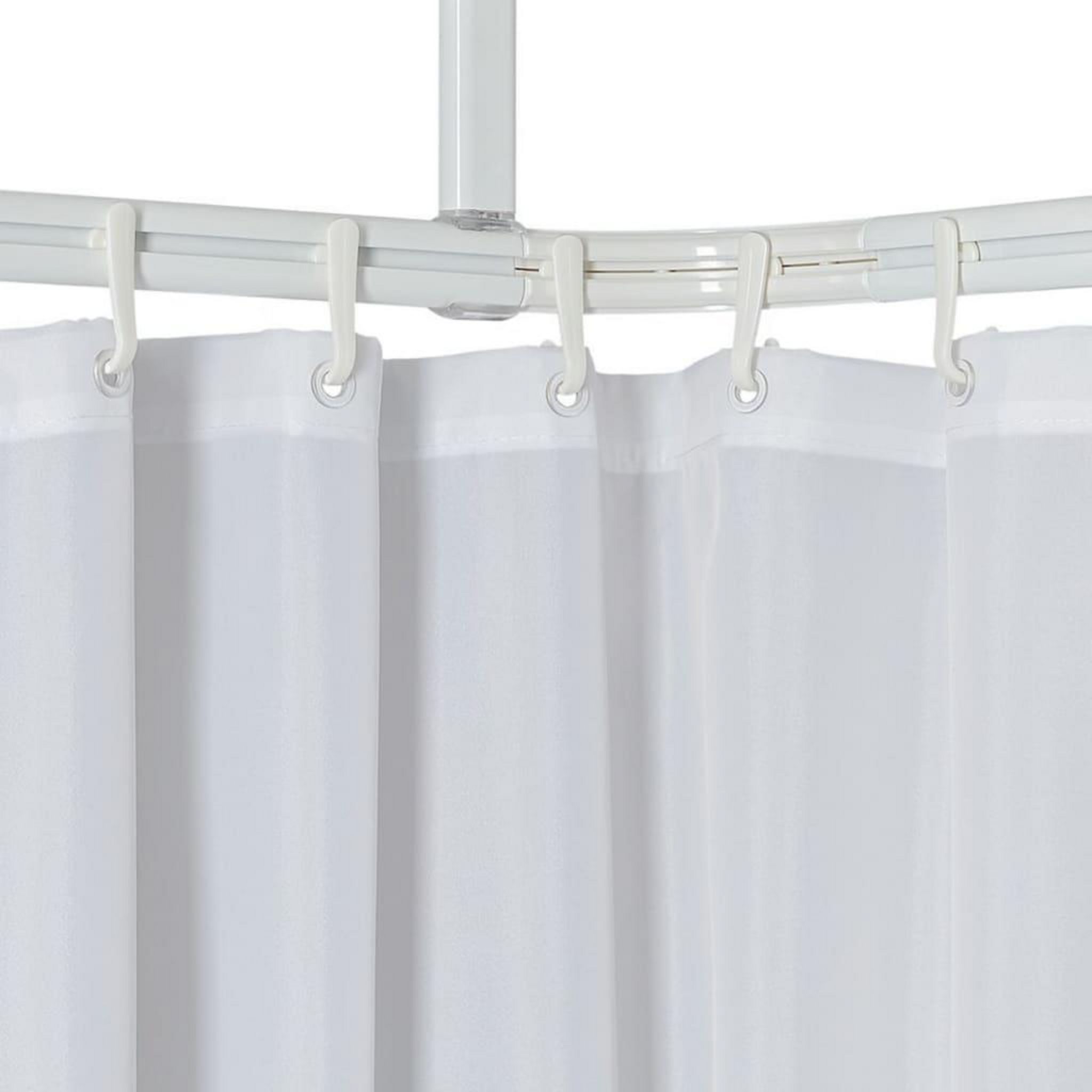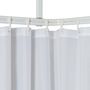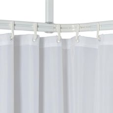 Cet ensemble se compose de trois tringles de douche droites avec rails integres, de deux pieces de raccordement courbees, de douze crochets et d'un support de plafond. Les tringles a rideau de douche sont faciles a decouper. Le support de plafond est fixe au rail de sorte que les crochets avec le rideau de douche puissent etre deplaces librement de gauche a droite et vice versa le long des rails.
