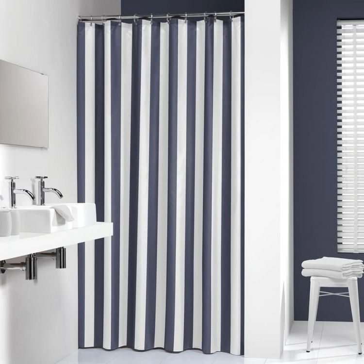 Ce rideau de douche bleu Linje de la marque Sealskin est parfait pour les personnes qui aiment les lignes epurees et droites et celles qui souhaitent garder leur salle de bain seche pendant la douche. En raison de la combinaison de couleurs altique du bleu et du blanc, la salle de bain est impregnee