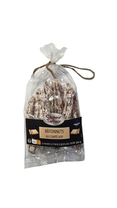 Ingrédients : Viande de porc d'origine : Espagne (161 g pour 100 g de produit fini), Fromage COMTÉ 10 % (LAIT, présure, ferments, sel), LACTOSE, sel, dextrose, sucre, poivre, ail, conservateur : nitrite de sodium, ferments, boyau artificiel comestible.