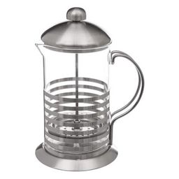 Informations Techniques : Dimensions : L. 15 x l. 10 x h. 22 cm Matières : Polypropylène, Inox & Verre Spécificités : Pratique & Utile Cafetière à Piston Design à Rayures Contenance : 80cl Poids : 0.300 kg Parfum : Argent